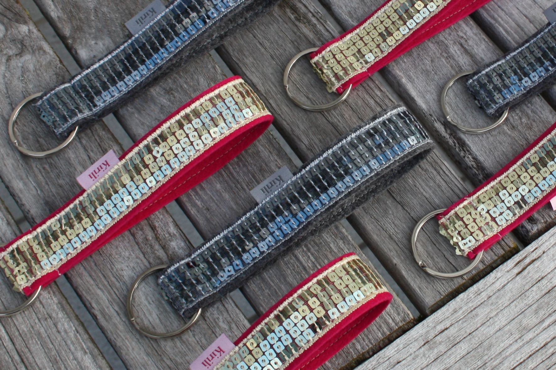 Dieser Schlüsselanhänger ist aus reinem Wollfilz mit Pailettenband. Ca. 15 cm lang und 2,6 cm breit.